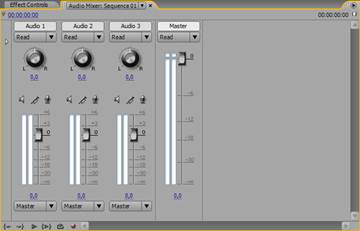 Рисунок 6 - Экран Source (Источник) На некоторых этапах создания фильма экран Source (Источник) не нужен, поэтому в целях экономии пространства монитора производители программы добавили на него дополнительныеэлементы управления, расположив их на отдельных вкладках: -Effect Controls (Управление эффектом). На этой вкладке расположены элементы управления для изменения свойств видео- и звуковых эффектов и переходов. В данный момент ваш проект не содержит никаких исходных компонентов, поэтому эта вкладка пуста. По мере добавления эффектов и переходов в проект на вкладке Effect Controls (Управление эффектом) будутпоявляйся новые элементы управления; - Audio Mixer (Звуковой микшер). На данной вкладке расположены элементы управления для изменения характеристикзвукового сопровождения создаваемого фильма. Здесь вы можете изменить громкость и баланс каждой звуковой дорожки или общего звукового сопровождения (рис. 7).