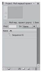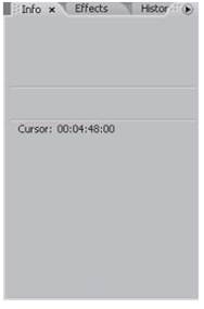 Рисунок 8 - Окно с вкладками Info (Информация), History (История), Effects (Эффекты) Остальные окна В левой верхней части окна программы Premiere Pro расположено окно Project (Проект). В данном диалоге размещаются все исходные компоненты фильма (клипы, звуковые и графические файлы). Здесь же автоматически появляются компоненты, которые вы создаете в процессе работы над фильмом (файлы титров и фрагменты клипов). В верхней части окна Project (Проект) (рис. 9) расположено небольшое окно предварительного просмотра, в котором можно посмотреть клип или графический файл до помещения на экран Source (Источник) или последовательность Timeline (Окно монтажа). В этом диалоге также можно создавать корзины для сортировки различных исходных компонентов фильма. Например, одна корзина может содержать видеофрагменты, другая звуковые файлы и т. д. Это может быть удобным, если фильм создается из большого количества фрагментов.