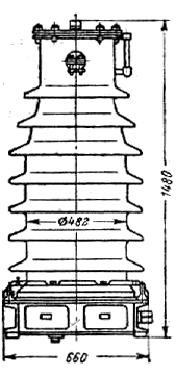 Рис. 2.1. Проходной одновитковый трансформатор тока типа ТПОЛ-Р/Р со стержневой первичной обмоткой. Проходная конструкция имеет в данном случае особую ценность, так как в закрытых распределительных устройствах возможность “пройти” трансформатором тока через перекрытие или через стену позволяет сэкономить соответствующий проходной изолятор. Проходной многовитковый трансформатор тока в качестве основы имеет два проходных изолятора, скреплённых в средней части. Через внутренние полости проходных изоляторов протягивается столько витков первичной обмотки, сколько необходимо для достижения расчётных ампер-витков, обеспечивающего требуемый класс аппарата. На средней части втулок, под заземлённым фланцем, располагаются сердечники с вторичными обмотками, которые закрываются кожухом. Обычно ввод первичной обмотки располагается на верхней головке (по отношению к заземлённому фланцу). 2.3 Проходные стержневые трансформаторы тока В стержневых трансформаторах тока первичная обмотка проходит через окно сердечника только один раз. Следовательно расчётное количество ампер-витков здесь всегда численно равно номинальному току и увеличено быть не может. Этим обуславливается специфическая особенность стержневых трансформаторов тока: чем больше ток – тем больше точность аппарата, а чем меньше ток - тем меньше его точность. Стержневые трансформаторы тока могут быть изготовлены как с прямоугольными, так и с круглыми сердечниками, но в большинстве случаев наиболее целесообразным является круглый сердечник (в принципе обладающий наименьшей длиной магнитного пути). 2.4 Шинные трансформаторы тока Шинными называют такие трансформаторы тока, в конструкцию которых входят сердечники с вторичными обмотками и главная изоляция соответственно данному номинальному напряжению, а первичная обмотка как конструктивный элемент отсутствует. В главной изоляции трансформатора предусматривается окно, через которое пропускают шину распределительного устройства; она-то и выполняет функции первичной обмотки. Таким образом, шинные трансформаторы тока принципиально являются аппаратами больших номинальных токов – от 2000, А и выше. Впрочем, простота и удобство конструкции иногда побуждают применять шинные трансформаторы тока и при более низких номинальных токах. 3. ТРАНСФОРМАТОРЫ ТОКА ДЛЯ НАРУЖНОЙ УСТАНОВКИ Переход ко всё более высоким напряжениям и потребность в аппаратах для наружной установки обусловили при конструировании трансформаторов тока повторение того пути, который был уже пройден конструкциями силовых трансформаторов: катушечный трансформатор тока погружался в бак с маслом или заливался в баке компаундом. Это повышало его электрическую прочность, обеспечивало влагостойкость и открывало возможность установки его на открытых подстанциях. Появился тип баковых, или горшковых, трансформаторов тока. Несмотря на погружение в масло, при переходе к более высоким напряжениям пришлось существенно увеличивать размеры окна сердечника и усиливать изоляцию между обмотками. Это привело к тому, что для баковых трансформаторов тока стали характерны весьма большие размеры и вес. От заполнения баков компаундной массой отказались ввиду плохого теплоотвода, опасности появления в компаунде трещин и возможности взрывов. Баковые трансформ