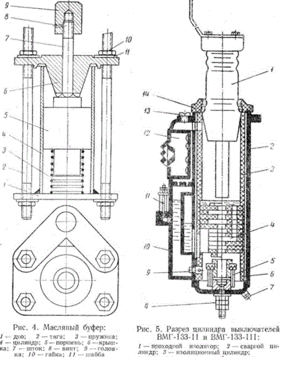 Конструкция и основные размеры масляных выключателей типа ВМГ указаны на рис. 1. Каждый выключатель состоит из сварной рамы 8, к нижней части которой болтами М12 прикреплены три сдвоенных опорных изолятора 9. На изоляторы подвешены цилиндры. В верхней части рамы расположен вал 10 с приваренными к нему тремя двуплечими рычагами 4. Для установки рычага дистанционной передачи привода вал выведен консольно в обе стороны рамы. Выключатель включается поворотом вала на угол около 54°. К коротким плечам крайних рычагов вала прикреплены две работающие па растяжение пружины 7, которые служат для отключения выключателя и удержания его в отключенном положении. В верхней части рамы установлен пружинный буфер 5, предназначенный для смягчения ударов при включении выключателя и для создания необходимой скорости отключения в момент размыкания контактов. Крепление цилиндра к раме показано на рис. 2, конструктивное устройство пружинного буфера — на рис. 3. Для смягчения ударов при отключении установлен масляный буфер (рис. 4). Движение от рычагов вала к токоведущим стержням 2 (см. рис. 1) передается фарфоровыми тягами 3. Для крепления выключателя к стене или к поддерживающей конструкции в опорных угольниках рамы имеются четыре отверстия Ml6 под болты.
