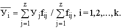 В основу группировки положены два изучаемых во взаимосвязи признака – Х и У. Частоты fij показывают количество соответствующих сочетаний Х и У. Если fij расположены в таблице беспорядочно, можно говорить об отсутствии связи между переменными. В случае образования какого-либо характерного сочетания fij допустимо утверждать о связи между Х и У. При этом, если fij концентрируется около одной из двух диагоналей, имеет место прямая или обратная линейная связь. Наглядным изображением корреляционной таблице служит корреляционное поле. Оно представляет собой график, где на оси абсцисс откладывают значения Х, по оси ординат – У, а точками показывается сочетание Х и У. По расположению точек, их концентрации в определенном направлении можно судить о наличии связи. В итогах корреляционной таблицы по строкам и столбцам приводятся два распределения – одно по X, другое по У. Рассчитаем для каждого Хi среднее значение У, т.е.