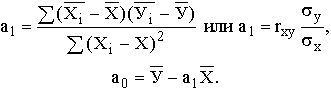 т.е. сумма квадратов отклонений эмпирических значений зависимой переменной от вычисленных по уравнению регрессии должна быть минимальной. Сумма квадратов отклонений является функцией параметров а0 и а1. Ее минимизация осуществляется решением системы уравнений