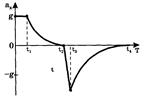 На рисунке представлен гpaфик зависимости проекции ускорения, с которым падает парашютист, от времени. Парашютист находится в состоянии невесомости в течение следующего промежутка времени: