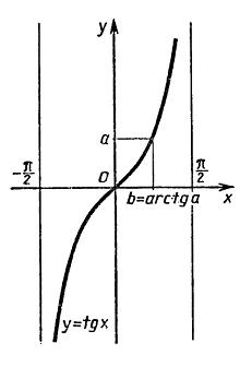 Функция тангенса возрастает на интервале (-π/2; π/2) и принимает все значения из поля действительных чисел. Следовательно, по теореме о корне для любого числа a на интервале (-π/2; π/2) существует единственный корень b уравнения tg(x)=a. Это число b называют арктангенсом числа a и обозначают arctg(a) (см. рисунок ниже).