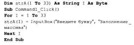 Первый способ состоит в том, что значения элементов массива вводятся пользователем с помощью функции ввода InputBox. Например, заполнить строковый массив stг А (I) буквами русского алфавита можно с помощью следующей программы (событийной процедуры) на языке Visual Basic: