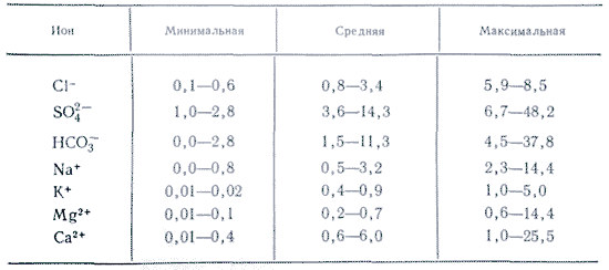 Атмосферные осадки из всех природных вод наименее минерализованы, но по химическому составу растворенных в них веществ они не менее разнообразны, чем другие природные воды. Источником их состава являются аэрозоли атмосферы. Ионный состав их довольно разнообразен. При колебаниях средней многолетней минерализации атмосферных осадков в европейской части России в пределах 10-20 мг/л и экстремальных значениях для всей территории 3-4 и 50-60 мг/л ионный состав характеризуется пестротой, причем среди анионов большей частью преобладает SO42-или HCO3-, а среди катионов в зависимости от степени удаленности от побережья Ca2+или Na+. Непосредственно у побережья при ветре, дующем с моря, в результате ветрового механического выноса солей концентрация хлора в осадках бывает повышенной. По мере удаления от побережья относительная концентрация Cl- падает, а SO42-, Ca2+ и Mg2+, наоборот, повышается. Причиной повышения содержания SO42- и Ca2+ является обогащение атмосферы аэрозолями континентального происхождения. По мере продвижения в глубь континента часть морских аэрозолей вымывается. Наибольшие изменения испытывает концентрация SO42-. Если увеличение содержания Ca2+ и Na+ связано, скорее всего, с минеральной пылью почв и пород, на поверхности которых всегда присутствуют эти соли, то увеличение содержания SO42- обусловлено, с одной стороны, окислением SO2 и H2S, с другой - поднятием сернокислых солей с засоленных поверхностей.