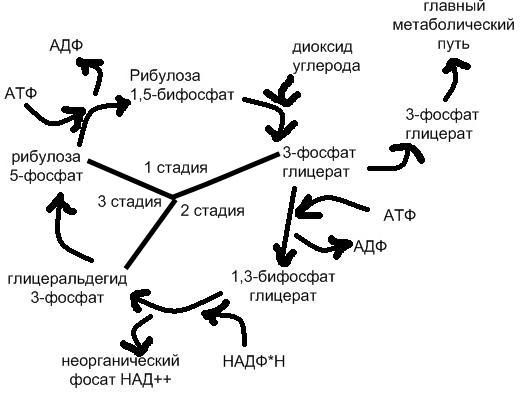 В цикл вовлекаются АТФ и НАДФ·Н, образованные в ЭТЦ фотосинтеза, углекислый газ и вода; основным продуктом является глицеральдегид-3-фосфат. Поскольку АТФ и НАДФ·Н могут образовываться в разных метаболических путях, цикл не следует рассматривать строго привязанным к световой фазе фотосинтеза. Общий баланс реакций цикла можно представить уравнением: 3 CO2 + 6 НАДФ·Н + 5 H2O + 9 АТФ → C3H5O3-PO3 + 3 H+ + 6 НАДФ+ + 9 АДФ + 8 Фн. Две молекулы глицеральдегид-3-фосфата используются для синтеза глюкозы. Цикл состоит из трёх стадий (карбоксилирование, восстановление, регенерация): на первой под действием фермента рибулозобисфосфат-карбоксилаза/оксигеназа происходит присоединение CO2 к рибулозо-1,5-дифосфату и расщепление полученной гексозы на две молекулы 3-фосфоглицериновой кислоты (3-ФГК). На второй 3-ФГК восстанавливается до глицеральдегид-3-фосфата (фосфоглицеральдегида, ФГА), часть молекул которого выходит из цикла для синтеза глюкозы, а другая часть используется в третьей стадии для регенерации рибулозо-1,5-дифосфата. Карбоксилирование. Карбоксилирование рибулозо-1,5-бисфосфата (5-углеродное соединение) осуществляется в несколько стадий. На первой кетонная группа рибулозы восстанавливается до спиртовой, между 2 и 3 атомами углерода устанавливается двойная связь. Полученное соединение нестабильно и именно оно карбоксилируется с образованием 2-карбокси-3-кето-D-арабитол-1,5-бисфосфата. Его структурный аналог 2-карбокси-D-арабитол-1,5-бисфосфат ингибирует весь процесс. Новое, уже 6-углеродное соединение, также нестабильно и распадается на две молекулы 3-фосфоглицериновой кислоты (3-фосфоглицерат, 3-ФГА). Восстановление. Восстановление 3-фосфоглицериновой кислоты (3-ФГА) происходит в две реакции. Сначала каждая 3-ФГА с помощью 3-фосфоглицераткиназы и с затратой одной АТФ фосфорилируется, образуя 1,3-бисфосфоглицериновая кислота (глицерат-1,3-бисфосфат). Затем под действием глицеральдегид-1,3-фосфатдегидрогеназы бисфосфоглицериновая кислота восстанавливается НАД(Ф)·H (у растений и цианобактерий; у пурпурных и зелёных бактерий восстановителем является НАД·H) параллельно с отщеплением одного остатка фосфорной кислоты. Образуется глицеральдегид-3-фосфат (фосфоглицеральдегид, ФГА, триозофосфат). Обе реакции обратимы. Регенерация. На последней стадии 5 молекул глицеральдегид-3-фосфатов превращаются в три молекулы рибулозо-1,5-бисфосфата. Вначале под действием трифосфат-изомеразы глицеральдегид-3-фосфат изомеризуется в дигидроксиацетон-фосфат. Фруктозабисфосфат-альдолаза объединяет их в фруктозо-6-фосфат с отщеплением остатка фосфорной кислоты. Затем следует ряд реакций перестройки углеродных скелетов и образуется рибулозо-5-фосфат. Он фосфорилируется фосфорибулокиназой и рибулозо-1,5-бисфосфат регенерируется.
