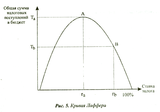 Кривая А. Лаффера - график, показывающий функциональную связь между налоговыми ставками и объемом налоговых поступлений, выявляющий такую ставку, при которой налоговые поступления достигают максимума и создаются наиболее благоприятные условия для предпринимательства.