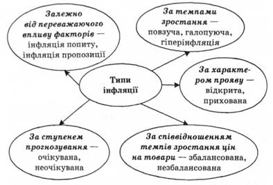 Рис. 6.17. Типи інфляції відбувається спад виробництва та скорочення товарообороту, втрачається стимул до інвестицій, стримується процес суспільного нагромадження, поширюється відплив капіталу з виробничої сфери до сфери обігу, тобто йде розбалансування економічної рівноваги. Гіперінфляція - інфляція, коли ціни зростають астрономічно - на 1-2 % щодня або сягають 1000 % і більше нарік. Вона означає глибоку економічну і соціальну кризу в країні. Збалансована інфляція - інфляція, коли ціни товарів різних товарних груп відносно один одного не змінюються. Ціни підвищуються досить повільно й одночасно на більшість товарів та послуг. Незбалансована інфляція - інфляція, коли співвідношення цін у різних товарних групах змінюється на різні відсотки і по-різному на кожний вид товару. Очікувана інфляція - зазвичай помірна інфляція, яку можна спрогнозувати на будь-який період. Досить часто це є прямим результатом антиінфляційних дій уряду. Неочікувана інфляція характеризується раптовим стрибком цін, зумовленим збільшенням під впливом інфляційних очікувань суспільного попиту населення на споживчі товари, товаровиробників - на сировину та засоби виробництва. Інфляція попиту - це порушення рівноваги між попитом і пропозицією з боку попиту. Спричинити її може в основному збільшення державних замовлень (наприклад, військових), попиту підприємців на засоби виробництва в умовах повної зайнятості й майже повної завантаженості виробничих потужностей, а також зростання купівельної спроможності трудящих (зростання заробітної плати) в результаті, наприклад" узгоджених дій профспілок. Усе це спричиняє утворення надлишку грошей порівняно з кількістю товарів, призводить до підвищення цін. Таким чином, надлишок платіжних засобів в обігу створює дефіцит пропозиції, коли виробники не можуть адекватно реагувати на зростання попиту. Інфляція пропозиції (витрат) - це зростання цін внаслідок підвищення витрат виробництва чи скорочення сукупної пропозиції. Причинами збільшення витрат можуть бути зростання цін на сировину, енергоносії, підвищення заробітної плати, оліго-полістична політика ціноутворення, економічна і фінансова політика держави і т. ін. Збільшення витрат виробництва на одиницю продукції в економіці скорочує прибутки й обсяг продукції, який підприємці готові запропонувати за наявного рівня цін. Внаслідок цього зменшується сукупна пропозиція товарів та послуг, що, у свою чергу, підвищує рівень цін. Стагфляція - це інфляція, що супроводжується стагнацією виробництва й одночасно зростанням рівня цін і безробіття. Рівень (темп) інфляції обчислюють за формулою