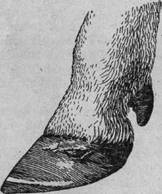 Рис. 44. Остроугольное копытце у крупного рогатого скота (белой линией показан чрезмерно отросший рог копытцевой стенки)