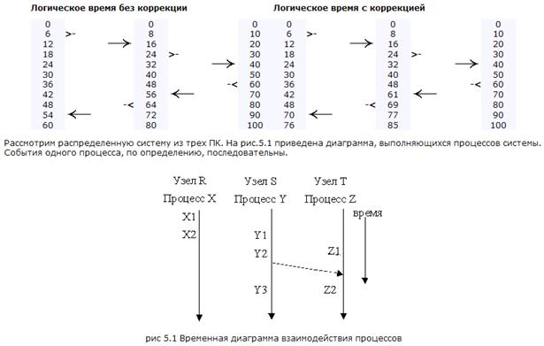 Теперь предположим, что у каждого процесса имеются локальные часы, показания которых, могут расходиться. Для записи времени событий в каждом отдельном процессе можно использовать локальные часы, но при этом нужно выработать определенные соглашения о том, какое из событий побеждает (то есть происходит первым) при совпадении отметок времени. Например, для этого отметку времени можно дополнять идентификатором процесса. Общая последовательность событий в системе будет соблюдаться, если сможем гарантировать, что сдвиг частоты не вызовет нарушения ограничений. Предположим, что процесс X включает в отправляемое процессу Y сообщение отметку времени (отправка (m, tx)). Когда процесс Y получает это сообщение (получение (m, tx)), его собственные часы показывают ty (рис.5.2). -Если Ty > Tx, то все в порядке -Если Ty < Tx, то имеет место нарушение ограничения на порядок событий.