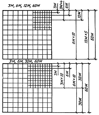 2.4. Укрупненные модули для размеров в плане каждого конкретного вида зданий, его планировочных и конструктивных элементов, проемов и т. д. должны составлять группу, выбранную из общего ряда, установленного п. 2.2, таким образом, чтобы каждый относительно больший модуль был кратен всем меньшим, чем достигается совместимость членений модульных сеток (черт. 3).