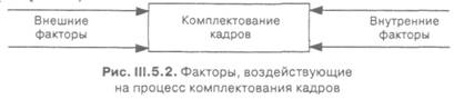 где Сp.m.i – необходимое число рабочих мест; Сp.i – численность работников во всех сменах. Очевидно, что процесс комплектования кадров, как, в принципе, и любой другой, подвержен влиянию различных факторов; Традиционно их разделяют на внешние и внутренние (рис. III.5.2). Внешние факторы: • демографические (пол, возраст и т.п.); • социально-экономические (образование, уровень дохода и т.п.); • правовые (КЗоТ РФ и другие нормативные акты); • научно-технические (организационно-технический уровень предприятия).