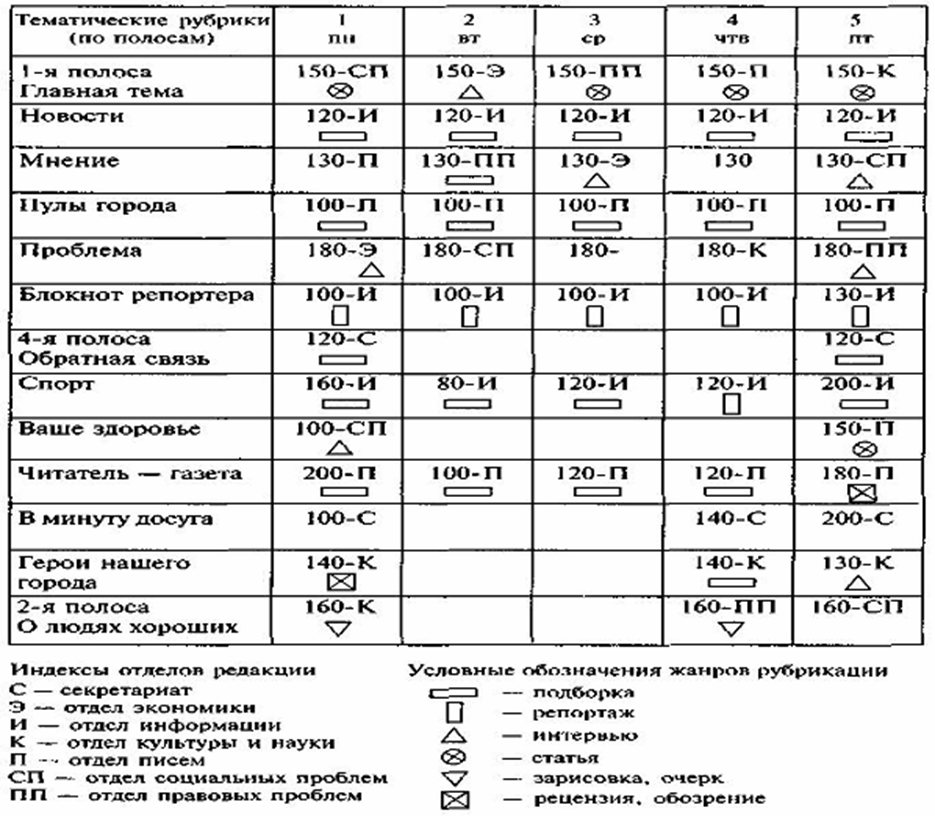 Основные виды творческих отделов СМИ и специфика их работы. Примерный график верстки газеты План номера газеты, подготовленный в секретариате Ответственный секретарь имеет в зависимости от типа издания от одного до четырех заместителей. составляет макеты (графические рисунки) будущих полос подбирает материалы и иллюстрации читает материалы, подготовленные отделами всегда в курсе того, что находится в «редакционном портфеле». контролирует выполнение графика поступления материалов в секретариат, регулярность публикации рубрик, полос, подборок организует работу отдела верстки входит в состав редколлегии, участвует в разработке стратегии газеты, решает вопросы, связанные с перспективным планированием. Темы… Жанры… Отделы… Авторы… Сроки сдачи… Фото… Полосы..
