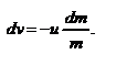 Рассмотрим движение ракеты в невесомости, т.е. . Пусть в начальный момент времени t = 0 скорость ракеты . Масса ракеты вместе с топливом равна M, масса самой ракеты . Ракета при горении топлива может выбрасывать газы со скоростью u. Какую максимальную скорость v может развить ракета при полном расходовании топлива? Из уравнения Мещерского в этом случае получаем mdv = - udm, или Проинтегрируем левую и правую части этого уравнения .
