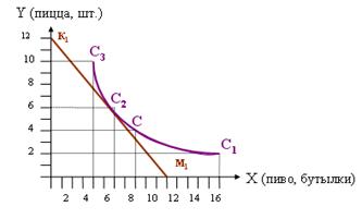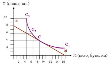 Но наши желания ограничены нашими возможностями. Поэтому, чтобы окончательно определить какой товар купить, нужно построить линию бюджетного ограничения. Точка пересечения двух кривых – это точка равновесия. Она отражает максимально возможную полезность при данном ограниченном доходе.