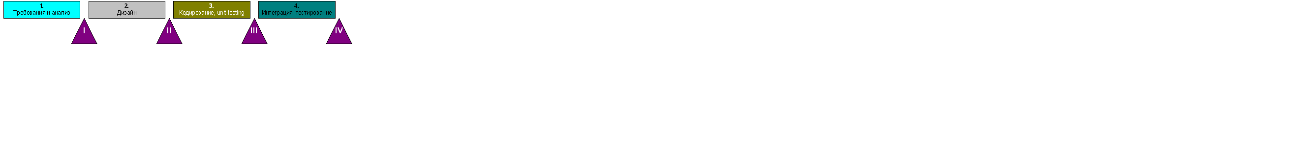 В основе RUP лежат следующие принципы: - Ранняя идентификация и непрерывное (до окончания проекта) устранение основных рисков. - Концентрация на выполнении требований заказчиков к исполняемой программе (анализ и построение модели прецедентов (вариантов использования)). - Ожидание изменений в требованиях, проектных решениях и реализации в процессе разработки. - Компонентная архитектура, реализуемая и тестируемая на ранних стадиях проекта. - Постоянное обеспечение качества на всех этапах разработки проекта (продукта). - Работа над проектом в сплочённой команде, ключевая роль в которой принадлежит архитекторам. RUP использует итеративную модель разработки. В конце каждой итерации (в идеале продолжающейся от 2 до 6 недель) проектная команда должна достичь запланированных на данную итерацию целей, создать или доработать проектные артефакты и получить промежуточную, но функциональную версию конечного продукта. Итеративная разработка позволяет быстро реагировать на меняющиеся требования, обнаруживать и устранять риски на ранних стадиях проекта, а также эффективно контролировать качество создаваемого продукта. 10. RUP: Основные стадии. [вверх] Полный жизненный цикл разработки продукта состоит из четырех фаз, каждая из которых включает в себя одну или несколько итераций: Начальная стадия (Inception), активности: - Формируются видение и границы проекта. - Создается экономическое обоснование (business case). - Определяются основные требования, ограничения и ключевая функциональность продукта. - Создается базовая версия модели прецедентов. - Оцениваются риски. Уточнение (Elaboration), активности: - Документирование требований (включая детальное описание для большинства прецедентов). - Спроектированную, реализованную и оттестированную исполняемую архитектуру. - Обновленное экономическое обоснование и более точные оценки сроков и стоимости. - Сниженные основные риски. Построение (Construction) Во время этой фазы происходит реализация большей части функциональности продукта. Фаза Построение завершается первым внешним релизом системы. Внедрение (Transition) Во время фазы Внедрение создается финальная версия продукта и передается от разработчика к заказчику. Это включает в себя программу бета-тестирования, обучение пользователей, а также определение качества продукта. 11. RUP: Milestones (промежуточные фазы). [вверх] Milestones – определенная контрольная точка, к которой заинтересованные стороны должны прийти к согласию относительно хода процесса разработки.
