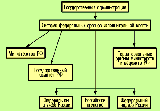 Правительство является высшим органом исполнительной власти в РФ, но основной объем повседневной, текущей работы по государственному управлению в различных сферах жизни общества выполняется федеральными органами исполнительной власти. Указом Президента РФ от 9 марта 2004 г. № 314 «О системе и структуре федеральных органов исполнительной власти» проведена достаточно серьезная реформа системы исполнительной власти в России. Указ закрепляет три вида федеральных органов исполнительной власти:федеральное министерство (орган, осуществляющий функции по выработке государственной политики и нормативно-правовому регулированию в определенной сфере деятельности), федеральную службу (орган, осуществляющий функции по контролю и надзору в определенной сфере деятельности, а также специальные функции в области обороны, государственной безопасности, защитыи охраны Государственной границы РФ, борьбы с преступностью, общественной безопасности)и федеральное агентство (орган, осуществляющий в определенной сфере деятельности функции по оказанию государственных услуг, по управлению государственным имуществом и правоприменительные функции).При этом федеральные службы и федеральные агентства находятся в ведении федеральных министерств, которые осуществляют координацию и контроль их деятельности. Членами Правительства РФ являются руководители не всех федеральных органов исполнительной власти, а только министры и должностные лицав ранге министра. Ранг министра могут иметь как руководители отдельных федеральных служби федеральных агентств (например, директор ФСБ России), так и должностные лица, не осуществляющиенепосредственного руководства никакими ведомствами (так называемые министры без портфеля), – Полномочный представитель РФ при Европейском Союзе, Полномочный представитель Правительства РФв Государственной Думе, руководитель Аппарата Правительства РФ и др.