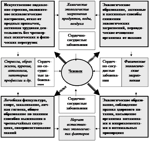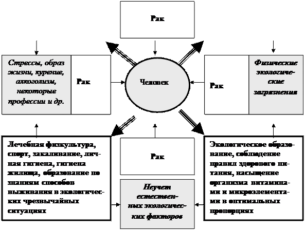4. Социальные факторы: образ жизни, вредные привычки (алкоголизм, курение, наркомания), особые условия профессиональной деятельности, физические и психические перегрузки, злоупотребление лекарственными препаратами. Некоторые мероприятия по противодействию экологическим загрязнениям рассмотрены первой части учебного пособия, а учет естественных экологических рассмотрен выше. Основными способами предупреждения сердечно-сосудистых заболеваний в социальной жизни являются научно обоснованное здоровое питание, отказ от вредных привычек, занятия лечебной физкультурой и спортом с учетом состояния здоровья, особенностей профессиональной деятельности, умение искусственно подавлять стрессы (аутотренинг, релаксация, визуализация, ребефинг, медитация). Вопрос 20. Основными причинами онкологических заболеваний являются: