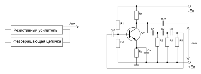 Такая схема называется генератором с трансформаторной связью. Колебательный контур состоит из индуктивной катушки При включении источника питания в коллекторной цепи транзистора возникает ток коллектора, который заряжает конденсатор колебательного контура. После заряда конденсатор разряжается на катушку 18. Вопрос: Генераторы RC-типа Ответ: Структурная схема RС -генератора изображена на рис.