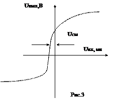 Электрическая схема приведена на рис., маркировка ОУ на рис.2 и в таблице 1. Обозначение интегральных микросхем (ИМС) состоит из четырех элементов. Первый из них – цифра, означающая группу ИМС. Питание ОУ-ля обычно дву–полярное - / +. Она определяется конструктивно-технологическим исполнением и включает следующие цифры: 1,5,6,7- полупроводниковые ИМС; 2,4,8-гибридные; 3-прочие (пленочные,вакуумные, керамические). Второй элемент – две или три цифры (от01 до 99 или от001 до 999), указывает на порядковый номер разработки серии ИМС. Первый и второй элементы образуют серию ИМС. Третий элемент- две буквы, соответствующие подгруппе и виду ИМС, определяющие основное функциональное назначение ИМС Четвертый элемент- число, обозначающее условный или порядковый в данной серии номер разработки. При необходимости разработчик ИМС имеет право после условного номера разработки дополнительно поместить букву (от А до Я), обозначающую отличие электрических параметров ИМС одного типа (например, 140УД1А, 140УД1Б). В начале обозначения ИМС, используемых в устройствах имеющих широкое применение, добавляется буква «К»(например, К140УД1А) Основными характеристиками ОУ являются передаточные характеристики: амплитудная, частотная, фазовая. Амплитудная характеристика на микросхеме К140УД8 по неинвертирующему входу приведена на рис.3. Напряжение смещения Ucм = ±(1÷5)мв.