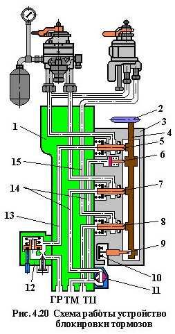 В действующей кабине ручка 2 блокировочного устройства должна быть повернута до упора вниз, а ручка 18 комбинированного крана устанавливается в поездное положение (Рис. 4.20). При этом кулачки эксцентрикового вала 4 отжимают клапаны 5, 7 и 8 от седел (открывают клапаны), а толкатель 9 перестает оказывать воздействие на электрический контакт 10, который замыкается под действием своей пружины. Воздух из ГР проходит через корпус 12 сигнализатора расхода воздуха и далее по каналу 13 и через открытый клапан 5 к крану машиниста. От крана машиниста сжатый воздух проходит в ТМ через открытый клапан 7, по каналу 14 и через пробку комбинированного крана. По каналу 14 воздух также подходит к блокировочному поршню, который под его воздействием утапливает свой хвостовик в выемке эксцентрикового вала 4 (запирает вал в его рабочем положении). От крана вспомогательного тормоза воздух поступает в ТЦ по каналу 15 через клапан 8. При переходе в другую кабину необходимо краном машиниста произвести полную разрядку ТМ, а ручку КВТ перевести в VI положение. При этом пружина выведет хвостовик блокировочного поршня 6 из зацепления с эксцентриковым валом 4 - вал будет разблокирован. После этого необходимо толкнуть ручку 2 на 180° до упора вверх и снять ее с квадрата вала 4. Клапаны 5, 7 и 8 освобождаются от воздействия кулачков эксцентрикового вала 4 и под усилиями своих пружин садятся на седла, перекрывая каналы 13, 14, 15, сообщающие ГР с КМ, кран машиниста с ТМ и КВТ с тормозными цилиндрами. Одновременно кулачок вала 4 будет воздействовать на толкатель 9, который размыкает электрический контакт 10, включенный в электрическую цепь трогания локомотива. Таким образом, исключается возможность приведения локомотива в движение. Если в рабочей кабине ручка 2 повернута вниз, но не занимает вертикального положения, то хвостовик блокировочного поршня 6 не будет утоплен в выемке эксцентрикового вала 4 и поршень 6 не перекроет обходной канал «А». В этом случае сжатый воздух из ТМ будет с шумом выходить в атмосферу, сигнализируя машинисту о необходимости правильной установки ручки 2. При следовании двойной тягой в рабочей кабине второго локомотива устройство блокировки тормозов должно быть включено, а ручка 18 комбинированного крана переведена в положение двойной тяги.