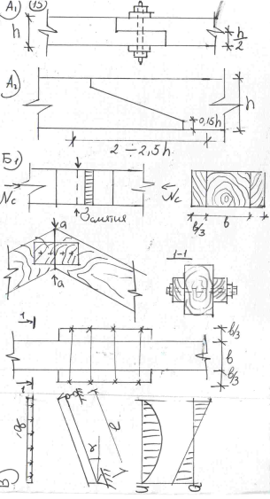 Врубками называют соед.в которых усилия от одного элемента к другому передаются непосредственно. Связи в этих соединениях отсутствуют. **применяется следующие виды врубок. -простейшие врубки (врубка в пол дерева или косой прируб) Рисунок А1 Врубка в пол дерева используется для соединения концов бревен и брусков. Рисунок А2 Косой прируб- для сращивания брусьев и бревен. -лобовой упор-самое распространенное соединение дер.констр. конструктивная суть сиединения заключается в упирании сжатых элементов пиленными торцами друг в друга или в поверхность опорных конструкций. При стыковке двух сжатых элементов они могут располагаться на одной линии или по углом. Рисунок Б1 Для предотвращения смещения, стык перекрывается накладками с двух сторон. Ширина накладок назначается конструктивно и ширина принимается не менее 1/3 ширины соединения элементов, а длина накладки не менее 3h. При симметричномзагружении конструкции в накладках не возникает усилий. Расчету принадлежит опорная поверхность соединения моментов на смятие. При несимметричном загруженииконструкции, накладки проверяются на поперечный изгиб .М наклонная=Q*l1 Где Q – поперечная сила Q=ql/2 Рисунок В - Лобовой упор в коньковом узле-количество болтов в соединении определяется расчетом. -лобовая врубка в опорном узле конструкции. нормальная лобовая врубка. Рисунок Г Метод конструирования врубки можно рассмотреть на примере опорного узла треугольного ферма из брусьев. h врубки-глубина-рекомендуется делать в опорных узлах фермы не более 1/3 h. Наименьшая глубина в брусьях 2 см и 3 см в бревнах Большая- 1/3 h-в брусьях и 1/4 h в бревнах. Для обеспечения необходимой прочности длина скалывания должна быть в следующих пределах-не менее 1,5h и не более 10h. Рассчитывается лобовая врубка с 1 зубом на прочность древесины в узле при смятии опорной площадки и при скалывании по плоскости сдвига.Несущая способность соединения должна быть больше оказанного воздействия, где F смятия величина площади смятия. Несущая способность соединения при смятии рассчитывается как: T=Fсмятия*Rсмятия альфа T –несущая способность соединения.