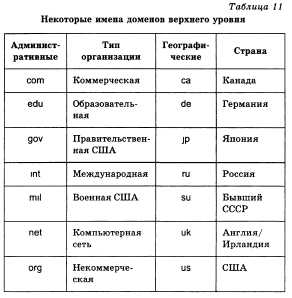 России принадлежит географический домен ru. Давно существующие серверы могут относиться к домену su (СССР). Обозначение административного домена позволяет определить профиль организации, владельца домена (табл. 11).
