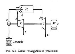 Принципиальная схема газотурбинной установки (ГТУ) представлена на рис. 6.4. Воздушный компрессор К сжимает атмосферный воздух, повышая его давление от р1 до р2 и непрерывно подает его в камеру сгорания КС. Туда же специальным нагнетателем Н непрерывно подается необходимое количество жидкого или газообразного топлива. Образующиеся в камере продукты сгорания выходят из нее с температурой Т3 и практически с тем же давлением (если не учитывать сопротивления), что и на выходе из компрессора (рз = р2)- Следовательно, горение топлива (т. е. подвод теплоты) происходит при постоянном давлении. В газовой турбине Т продукты сгорания адиабатно расширяются, в результате чего их температура снижается до Т4, а давление уменьшается до атмосферного р1. Весь перепад давлений р3 – p1 используется для получения технической работы в турбине lтех Большая часть этой работы lк расходуется на привод компрессора; разность lтех –lk является полезной и используется, например, на производство электроэнергии в электрическом генераторе ЭГ или на другие цели (при использовании жидкого топлива расход энергии на привод топливного насоса невелик, и в первом приближении его можно не учитывать).