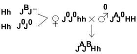 Предположим, что имеется редкий ген супрессор, рецессивный, он подавляет синтез антигена В. Н – проявление гена h – супрессор. Это взаимодействие неаллельных эквивалентных генов, действие которых может взаимоусиливаться. Пигментация кожи у человека. Допустим, что пигментация человека определяется двумя неаллельными эквивалентными генами, действие которых суммируется. В разных локусах: - А1, А2 – пигмент, - а1, а2 – нет