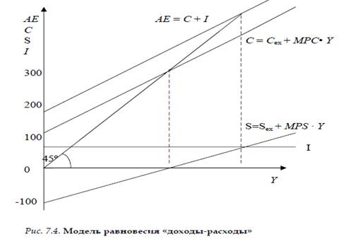 Модель равновесия «доходы-расходы» На протяжении нескольких десятилетий ХХ века в основе макроэкономической политики ведущих государств мира лежала теория Дж. М. Кейнса, согласно которой для достижения равновесия при полной занятости государство должно стимулировать сово- купный спрос. Недостаточность совокупного спроса обусловлена двумя основными при- чинами: 1. Действием основного психологического закона, согласно которому по мере рос- та дохода люди увеличивают долю дохода, идущую на сбережения. Для описания этой закономерности используются показатели средней и предельной склонности к потребле- нию и к сбережению. Средняя склонность к потреблению APC = С / Y показывает, какая доля дохода идет на потребление. Средняя склонность к сбережению APS = S / Y характеризует долю дохода, ко- торая сберегается. Предельная склонность к потреблению MPC = Δ C /Δ Y показывает изменение величины потребления в зависимости от изменения дохода. Предельная склонность к сбережению MPS = Δ S /Δ Y определяет изменение ве- личины сбережения в зависимости от изменения дохода. 2. Невысокой нормой прибыли на капитал вследствие высокого уровня процента (это снижает инвестиционный спрос со стороны фирм). В этих условиях задача государства – компенсировать при помощи государствен- ных расходов падение совокупного спроса. В кейнсианской модели «доходы–расходы» равновесие рынка достигается, когда совокупные расходы АЕ равняются совокупным доходам NI (национальному доходу), а NI = DI (располагаемому доходу). NI = DI обозначаем Y. Поток расходов представляет собой совокупный спрос, а поток доходов – совокупное предложение. Для построения модели необходимо записать следующие равенства: AE = Y, AD = AE, AS = Y, AE = C + I + G + NX. (7.6) От G и NX (спроса со стороны государства и внешнего рынка) мы абстрагируемся. Следовательно, AE = C + I. Y = C + S, C + I = C + S, I = S. (7.7) Строим систему координат: