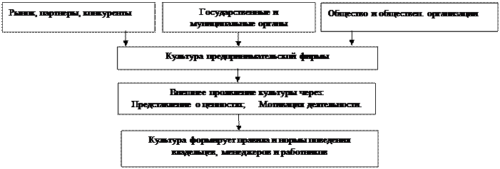 32. Культура предпринимательской фирмы формируется постепенно в течение многих лет. Основные внутренние факторы, оказывающие влияние на культуру предпринимательской фирмы: предмет и сфера деятельности фирмы; организация деятельности на фирме; мотивация собственников фирмы, её менеджеров и рядовых работников; уровень управленч. культуры, сложившаяся система взаимоотнош. руководителей и подчинённых; наличие условий, в которых наёмный персонал ощущает свою сопричастность к деят. фирмы; чёткий набор ценностей, к которому стремится весь коллектив; высокий професс-зм руководства фирмы, менеджеров и работников и возможность его повыш.; умение руководства брать на себя ответственность за все удачи и неудачи; выс. качество и интенсивность труда персонала с соответствующим матер. вознаграждением; ориентация всего коллектива на высокое качество производимых товаров/услуг; культура обслуживания покупателей; культура производства; степень соблюдения санитарии, гигиены, безопасности труда; моральный климат в коллективе. Влияние внешних факторов на формирование культуры предпринимательской фирмы схематически изображено на рисунке 3.3.2.
