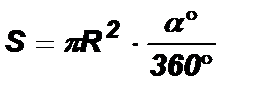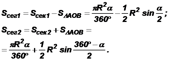 Вывод формулы площади сегмента. Из чертежа очевидно, что площадь сегмента может быть определена: а) как разность площадей сектора 1 и треугольника AOB, если ÐАОВ < 180°; б) как сумма площадей сектора 2 и треугольника AOB, если ÐАОВ > 180°.