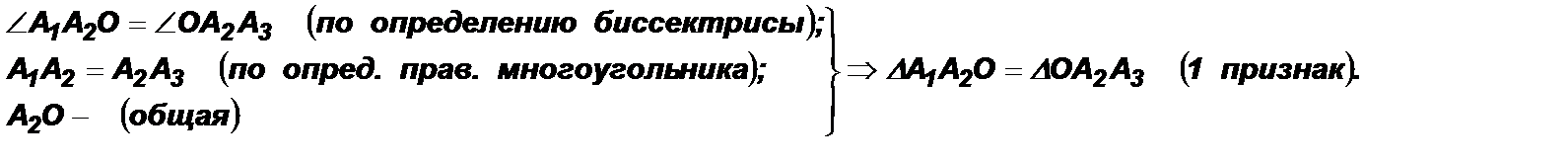 Дано: А1А2…Аn – правильный многоугольник. Доказать: 1) существует окружность с центром О, описанная около многоугольника А1А2…Аn; 2) эта окружность единственная. Доказательство: 1) Пусть лучи А1О и А2О – биссектрисы углов А1 и А2 – пересекаются в точке О. Докажем, что точка О – центр описанной около многоугольника А1А2…Аn окружности. 2) Рассмотрим ∆А1ОА2 – равнобедренный, т. к. 3) Рассмотрим ∆А1ОА2 и ∆А2ОА3.