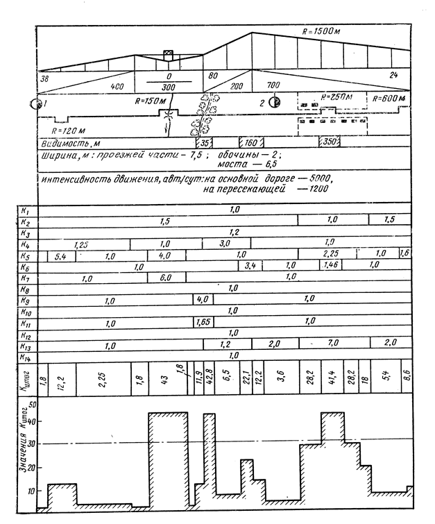 Для определения коэффициентов аварийности строят линейный график дороги (рис.3.1), на который наносят план и продольный профиль, выделяя на них все элементы, влияющие на безопасность движения (продольные уклоны, вертикальные кривые, мосты, кривые в плане, пересечения дорог, населенные пункты и т.д.). В особой графе указывают расстояние видимости. Под планом и профилем выделяют графы для каждого из учитываемых показателей. Опасными принято считать участки, имеющие итоговый коэффициент аварийности более 20 в равнинной однообразной местности и 40 в условиях пересеченного рельефа. График коэффициента аварийности позволяет наметить мероприятия по повышению безопасности движения и оценить их сравнительную эффективность. Так, например, для участка дороги на рис. 3.1. замена моста многоочковой трубой делает это место дороги практически безопасным.