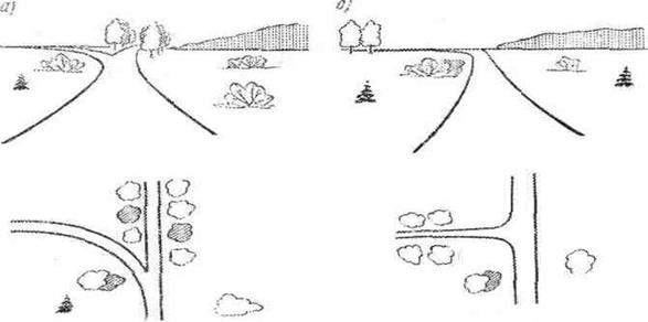 Рис.2.3. Примеры неудачных примыканий дорог, создающих у водителей неправильное представление о дальнейшем направлении дороги: а – ложный ход; б – кажущийся поворот