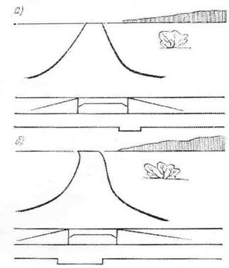 Рис.2.4. Неправильное представление у водителей о направлении дороги, вызванное ее скрытым поворотом: а – невидимый водителю издалека поворот; б – невидимый ночью поворот дороги под железнодорожный мост Чтобы придать этому коридору большую ясность и выразительность, особенно в ночное время, устанавливают специальные элементы обстановки дороги: столбики, возвышающиеся над поверхностью дороги и снабженные отражательными стеклами или светоотражательной фольгой, придорожные насаждения и пр. (рис.2.5.).