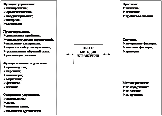 Как уже было отмечено, функции управления реализуются через методы. Осуществление такой функции управления, как построение организации, связано, например, с экономическими, организационно-распорядительными и правовыми (юридическими) методами, которые призваны создать эффективно работающую организацию в строгом соответствии с существующими законодательством и нормативно-правовыми актами в области хозяйственной деятельности и гражданских отношений. Социально-психологические методы основаны на комплексном использовании в менеджменте достижений поведенческих наук и служат инструментом для выражения функций организации и взаимодействия персонала, мотивации деятельных индивидуумов и групп. Для реализации функций управления, осуществления процесса принятия решения, управления подсистемами организации требуется множество методов управления (рисунок). Их необходимо не только классифицировать, но и структурировать по проблеме решения, условиям и факторам, сопутствующим решению. Для этого в организации должна накапливаться компьютерная база данных методов управления.