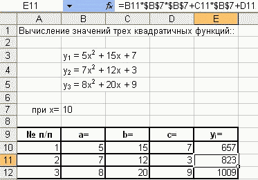 Поясним, как используются абсолютные и относительные адреса в программном комплексе Excel на примере решения следующей задачи. Расчет можно легко провести устно. Отметим, что величина x=10 остается постоянной для трех заданных формул, так как в данной задаче вычисление значений функций нужно производить в одной и той же точке x=10. Легко видеть, что коэффициенты a, b, c заданных квадратичных функий не постоянны и являются переменными величинами. Поэтому, по всей видимости, необходимо отвести специальную ячейку, например, B7, для хранения постоянного числа x=10, а коэффициенты a, b, c хранить в прямоугольной таблице (матрице). Отметим следующие существенные моменты, которые учитываются на этапе проектирования (моделирования) процесса решения задачи в программном комплексе Excel: 1. В ячейке A1 будет находиться наименование задачи: "Вычисление значений трех квадратичных функций:". 2. Строка 2 будет пропущена для того, чтобы наименование не сливалось с текстом задачи. Обычно так принято в книгах и в документах. 3. В третей, четвертой и пятой строках в ячейках B3, B4, B5 будет размещена текстовая информация о трех заданных квадратических функциях. Этот текст относится к постановке задачи и будет располагаться так, чтобы красиво смотрелось окончательное решение задачи. 4. В ячейка A7 будет записан текст: "при x=". Причем этот текст желательно выравнять по правому краю ячейки A7 для того, чтобы следующее за этим текстом число 10 из ячейки b7 точно примыкало к знаку = (равно). 5. Далее в ячейке B7, как сказано выше, будет находится постоянное число x=10. Его желательно выравнять по левому краю ячейки, дабы оно следовало точно за знаком равно из ячейки A7. Это число можно будет использовать в расчетах, так как оно находится в числовом формате в отдельной ячейке. 6. Строка 8 будет пропущена, так как далее будет следовать заголовок таблицы, а затем и сама таблица, содержащая исходную информацию и результатами решения задачи. 7. Строка 9 будет содержать следующие наименования (заголовки) столбцов проектируемой таблицы решения задачи: № п/п; a=; b=; c=; yi=. 8. Ниже в строках 10, 11 и 12 будет находиться исходная информация - коэффициенты заданных квадратичных функций и результаты решения задачи - вычисленные значения показателя yi. o в ячейку A10 число 1 - порядковый номер первой квадратичной функции y1 = 5x2 + 15x + 7; o в ячейку B10 число 5 - коэффициент при старшей степени величины x2 первой квадратичной функции, o в ячейку C10 число 15 - коэффициент при первой степени переменной величины x, o в ячейку D10 число 7 - свободный член. o Аналогично нужно занести в ячейку A11 число 2 - порядковый номер второй квадратичной функции y2 = 7x2 + 12x + 3, o в ячейку B11 - число 7 - коэффициент при x2, o в ячейку C11 число 12 - коэффициент при x, o в ячейку D11 - свободный член 3. o То же самое нужно проделать для третьей квадратичной функции y3 = 8x2 + 20x + 9. o В ячейку A12 - занести число 3 - порядковый номер третьей функции, o в ячейку B12 число 8 - коэффициент при x2, o в ячейку C12 число 12 - коэффициент при x o и в ячейку D12 число 9 - свободный член третьей функции. На этом постановка задачи и подготовка исходной матрицы расчетов завершается. 9. Как известно, любая формула всегда начнется со знака равно: =B10*$B$7*$B$7+C10*$B$7+D10 и заканчивается нажатием клавиши Enter. Следует обратить внимание на то, что формула расчетов одновременно отображается в строке формул и поэтому эту строку мож