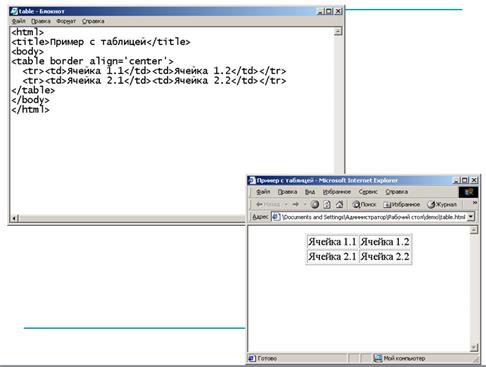 Обтекание текстом изображения. По умолчанию после вставки изображения следующая строка оказывается после рисунка. Если есть необходимость, чтобы текст обтекал рисунок, можно воспользоваться параметром align для тега <img>. Принудительное выравнивание по центру. В некоторых случаях возникает необходимость выровнять объект по центру документа, но либо объект не обладает свойством align, либо значение align=‘center’ отображается некорректно. В этих случаях используют тег принудительного выравнивания по центру <center> … </center> Перевод текста в верхний / нижний регистр. Для перевода фрагмента текста в верхний регистр используется тег - <sup> … </sup>. Для перевода фрагмента текста в нижний регистр используется тег - <sub> … </sub> Таблицы. Для оформления таблиц в документе используется несколько тегов: <table> … </table> - начало – конец таблицы, <tr> … </tr> - начало – конец строки таблицы, <td> … </td> - начало – конец ячейки строки таблицы. Вместе с тегом table обычно используют параметры: border – определение рамки таблицы; align – выравнивание таблицы в окне браузера; width – ширина таблицы (в пикселах или %).