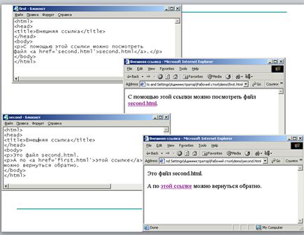 Ссылки можно разделить на: - внешние ссылки- указывающие на другие html-документы, хранящиеся на Вашем жестком диске; - внутренние ссылки - указывающие на какие-то элементы внутри данного документа; - ссылки на Интернет-ресурсы - указывающие на документы, находящиеся в сети Интернет; - ссылки на электронную почту – позволяет быстро обратиться к адресату электронной почты. Внутренние ссылки. Достаточно часто возникает необходимость включить ссылки на разные части текущего документа. Примером может служить оглавление со ссылками на текущие разделы. Для построения внутренней ссылки необходимо вначале создать указатель, показывающий место назначения при помощи тега, например <a name=‘#q’>Контрольные вопросы</a>. После того как указатель приобрел имя, можно создать ссылку на него <a href=‘#q’>Контрольные вопросы</a>. Внешние ссылки. Для создания внешней ссылки (на другой локальный html-документ) используют только одну часть – указатель, на тот документ, который должен быть открыт. Например, если необходимо из файла first.html перейти по ссылке к файлу second.html (и оба эти файла находятся о одном каталоге), достаточно включить следующую строку в html-код: <a href=‘second.html’>second.html</a>.