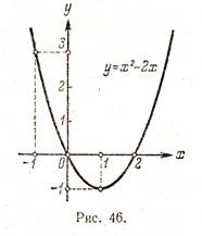 Например, для функции f(х) = х2 — 2x с помощью графика (рис. 46) находим f(-1) = 3, f(0) = 0, f(1) = -l, f(2) = 0 и т. д. График функции наглядно иллюстрирует поведение и свойства функции. Например, из рассмотрения рис. 46 ясно, что функция у = х2— 2х принимает положительные значения при х < 0 и при х > 2, отрицательные - при 0 < x < 2; наименьшее значение функция у = х2 - 2х принимает при х = 1. Для построения графика функции f(x) нужно найти все точки плоскости, координаты х, у которых удовлетворяют уравнению y = f(x). В большинстве случаев это сделать невозможно, так как таких точек бесконечно много. Поэтому график функции изображают приблизительно - с большей или меньшей точностью. Самым простым является метод построения графика по нескольким точкам. Он состоит в том, что аргументу х придают конечное число значений - скажем, х1, х2, x3,..., хk и составляют таблицу, в которую входят выбранные значения функции. Таблица выглядит следующим образом: