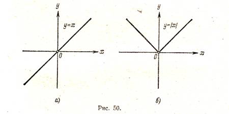 Пример 2. Построить график функции у = |х|. Решение. Берем график функции у = х (рис. 50, а) и часть этого графика при х < 0 (лежащую под осью х) симметрично отражаем относительно оси х. В результате мы и получаем график функции у = |х| (рис. 50, б).
