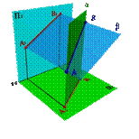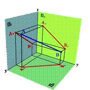 Обозначим углы между прямой и плоскостями проекций через α - с плоскостью П1, β - с плоскостью П2, γ- с плоскостью П3 и тогда получим: |А1В1|=|BA|cos a |A2B2|=|AB|cos b |A3B3|=|AB|cos g. Частный случай |A1B1|=|A2B2|=|A3B3| при таком соотношении прямая образует с плоскостями проекций равные между собой углы a=b=g=350, при этом каждая из проекций расположена под углом 450 к соответствующим осям проекций. Этот способ задания определяется тем что две непараллельные плоскости пересекаются в пространстве по прямой линии (этот способ подробно рассматривается в курсе элементарной геометрии). Пусть в плоскостях П1 и П2 даны проекции прямых заданных отрезками [А1В1] и [A2B2]. П роведем через эти прямые плоскости a и b перпендикулярные плоскостям проекций. В том случае если эти плоскости непараллельные (рис.16а), линией их пересечения будет прямая заданная отрезком [АВ], проекциями которой являются отрезки [А1В1] и [А2В2].