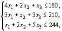 Для производства трех видов изделий А, В и С используется три различных вида сырья. Каждый из видов сырья может быть использован в количестве, соответственно не большем 180, 210 и 244 кг. Нормы затрат каждого из видов сырья на единицу продукции данного вида и цена единицы продукции каждого вида приведены в таблице 13. Определить план выпуска продукции, при котором обеспечивается ее максимальная стоимость, и оценить каждый из видов сырья, используемых для производства продукции. Оценки, приписываемые каждому из видов сырья, должны быть такими, чтобы оценка всего используемого сырья была минимальной, а суммарная оценка сырья, используемого на производство единицы продукции каждого вида,– не меньше цены единицы продукции данного вида. Таблица 13