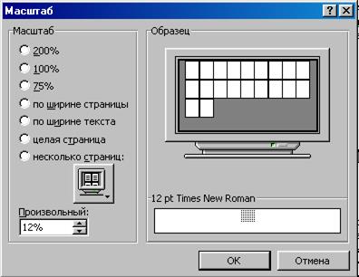 · Масштаб · В процессе работы можно изменять масштаб изображения: увеличивать изображение до 200% – для детальной работы или уменьшить – для просмотра общего вида страницы. · Для изменения масштаба можно воспользоваться кнопкой масштаб стандартной панели инструментов. При ее нажатии открывается список часто используемых масштабов, из которых можно выбрать нужный. · · Рис. 4.9. Окно диалога Масштаб · Для изменения масштаба отображения документа с помощью команды используется команда Вид –> Масштаб, в результате чего на экране появится окно диалога Масштаб (рис. 4.10). С помощью этого окна можно установить нужную степень увеличения или уменьшения текста. · Если требуется установить масштаб, который отсутствует в списке предопределенных значений, можно ввести нужное значение в поле Произвольный