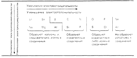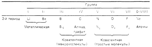 Строение атомов химических элементов на примере элементов второго периода и IV-A группы периодической системы химических элементов Д. И. Менделеева. Закономерности в изменении свойств этих химических элементов и образованных ими простых и сложных веществ (оксидов, гидроксидов) в зависимости от строения их атомов. При перемещении слева направо вдоль периода металлические свойства элементов становятся все менее ярко выраженными. При перемещении сверху вниз в пределах одной группы элементы, наоборот, обнаруживают все более ярко выраженные металлические свойства. Элементы, расположенные в средней части коротких периодов (2-й и 3-й периоды), как правило, имеют каркасную ковалентнуто структуру, а элементы из правой части этих периодов существуют в виде простых ковалентных молекул.
