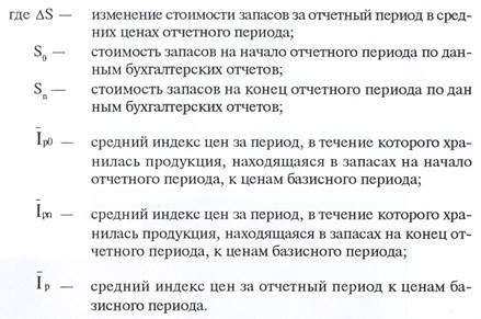 Существуют два варианта расчета изменения запасов незавершенного производства и готовой продукции: 1) по данным годовых отчетов о запасах на начало и конец года; 2) по данным квартальной отчетности о запасах на конец квартала. При использовании данных годовых отчетов изменение запасов незавершенного производства и готовой продукции в средних ценах отчетного периода определяется как разность между стоимостью запасов на конец и начало года, оцененных в средних ценах года. Средний индекс цен за отчетный год рассчитывается следующим образом: