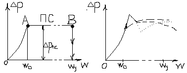 На рис.а-идеальная кривая для аппарата постоянного поперечного сечения f. На участке 0-А, где w<w0, слой еще неподвижен. В точке А воздействие газового потока становится равным весу ТМ в аппарате, и слой переходит в псевдоожиженное состояние. Как следует из формулы, перепад давления зависит от плотности, высоты и порозности ПОС