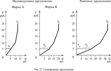 В целом причины изменения совокупных издержек идентичны причинам изменения в издержках отдельного производителя. Например, увеличение налогов и цен на ресурсы вызовет удорожание товара. Улучшение технологии, увеличение субсидий, уменьшение налогов и цен на ресурсы ведет к падению цен. Увеличение совокупного предложения отражается сдвигом кривой совокупного предложения вправо вниз (из AS0 в AS)). Уменьшение совокупного предложения отражается сдвигом его кривой влево вверх (из AS0 в AS2). Движение по кривой предложения инициируется изменением спроса. В таком случае кривая совокупного предложения остается на месте, а кривая совокупного спроса движется вдоль нее. Индивидуальное предложение - это соответствующее каждой данной цене количество товара, которое готов предложить к продаже на рынке тот или иной производитель (продавец). Переход к рыночному предложению аналогичен переходу от индивидуального к рыночному спросу. При этом возможно использование обоих методов: табличного и графического. Приведем пример графического решения. Пусть на рынке имеются только две фирмы производителя A и B. Зависимость их индивидуального предложения от цены представлена на двух первых графиках (рис. 27).